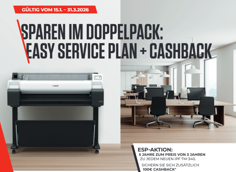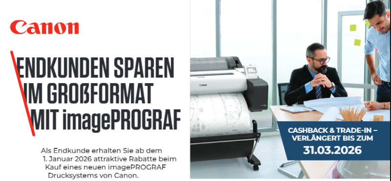 Sparen war noch nie einfacher. Unsere aktuellen iPF-Promotions bringen Bewegung in Ihr Geschäft – mit starken Argumenten für Ihre Kunden und attraktiven Mehrwerten für Sie als Händler. Für nahezu alle imagePROGRAF-Serien bieten wir gezielte Verkaufsanreize, die Nachfrage schaffen, Abschlussquoten steigern und Ihre Marge spürbar verbessern. Überblick verschaffen, Chancen nutzen und im 1. Quartal 2026 das Maximum an Marge herausholen. Alle Promotions sind gültig seit 01.01.2026 und befristet bis 31.03.2026.