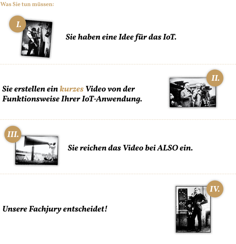 Seien Sie Ihr eigener Regisseur – nur Mut! Zeigen Sie uns Ihre Idee für das IoT in Form eines selbstgedrehten Videos. Die originellsten Einsendungen werden gleich doppelt belohnt: Sie werden ein „ Intel IoT Specialist“ und erhalten einen großzügigen Warengutschein zur freien Verwendung bei ALSO.