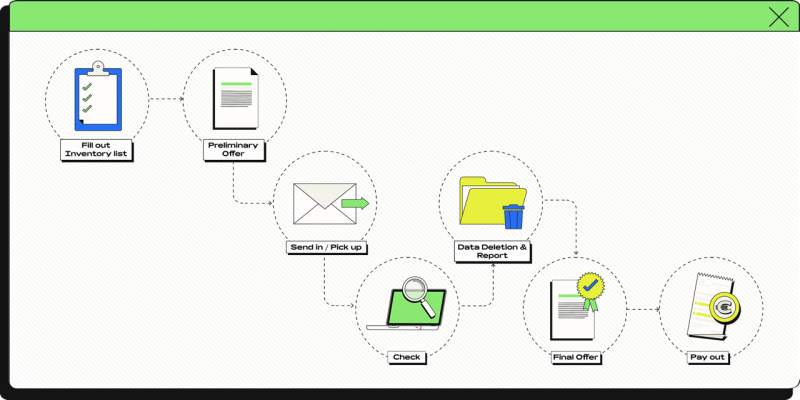 We only need a few details from you about the quantity, type and condition of the IT hardware to be recycled. Simply use our convenient web app to collect all the necessary information and receive a non-binding purchase offer in real time. If you agree, you can transmit the data online and send the goods to us, or we can organize collection in secure transport boxes - it's that simple.